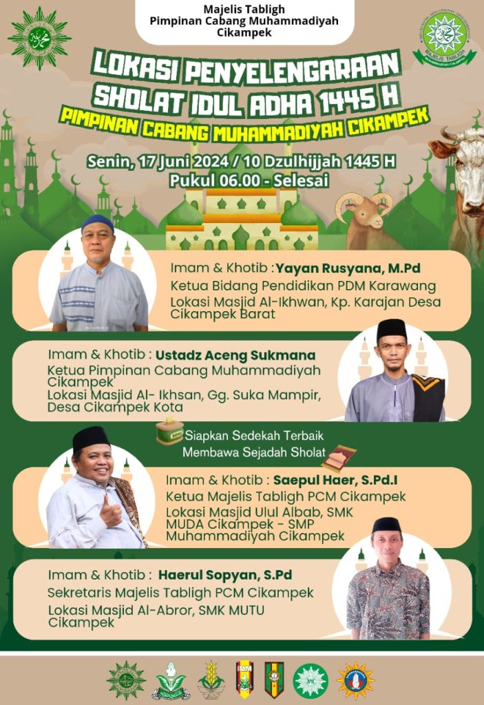 ## Pelaksanaan Sholat Idul Adha 1445 H di 4 Masjid Cikampek Pada hari Senin, 17 Juni 2024 bertepatan dengan 10 Dzulhijjah 1445 H, Majelis Tabligh Pimpinan Cabang Muhammadiyah (PCM) Cikampek telah sukses menyelenggarakan Sholat Idul Adha di empat lokasi berbeda. Acara yang dimulai pukul 06.00 ini berlangsung dengan khidmat dan penuh rasa syukur. ### Lokasi […]