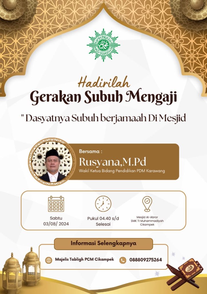 ### Gerakan Subuh Mengaji di Masjid Al Abror SMK Mutu Cikampek: Dahsyatnya Subuh Berjamaah Pada fajar yang tenang dan penuh berkah, suasana di Masjid Al Abror SMK Mutu Cikampek mendadak hidup dengan kehadiran para guru dan pemuda Muhammadiyah. Semua ini berkat Gerakan Subuh Mengaji yang diadakan oleh Majelis Tabligh Pimpinan Cabang Muhammadiyah Cikampek, dengan penggagas […]